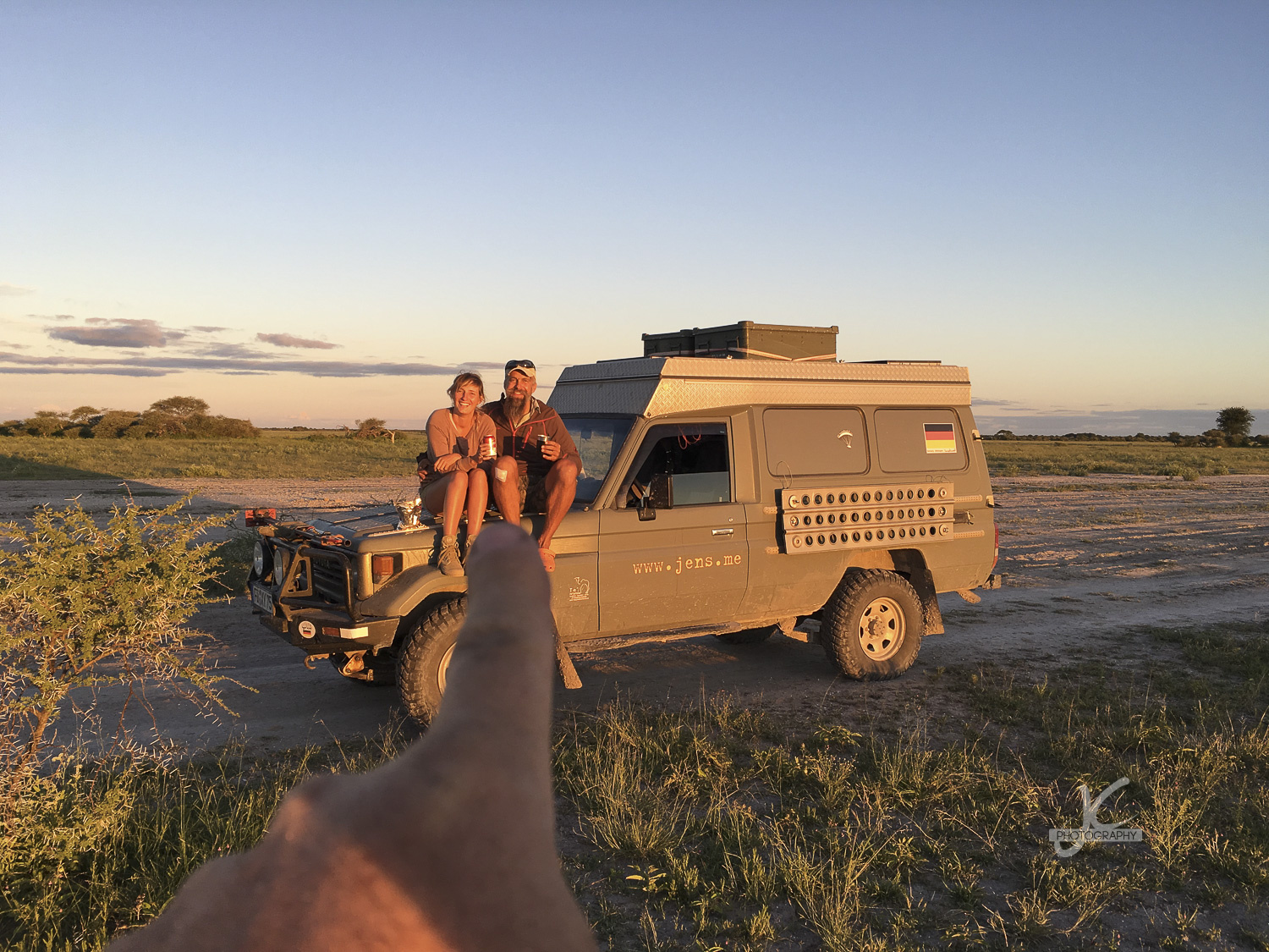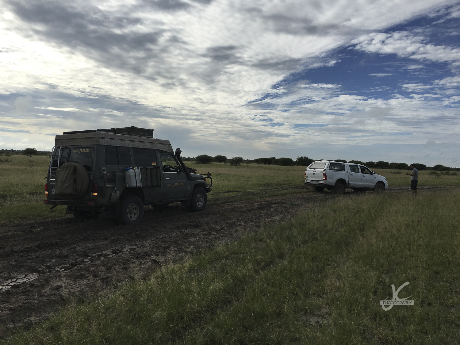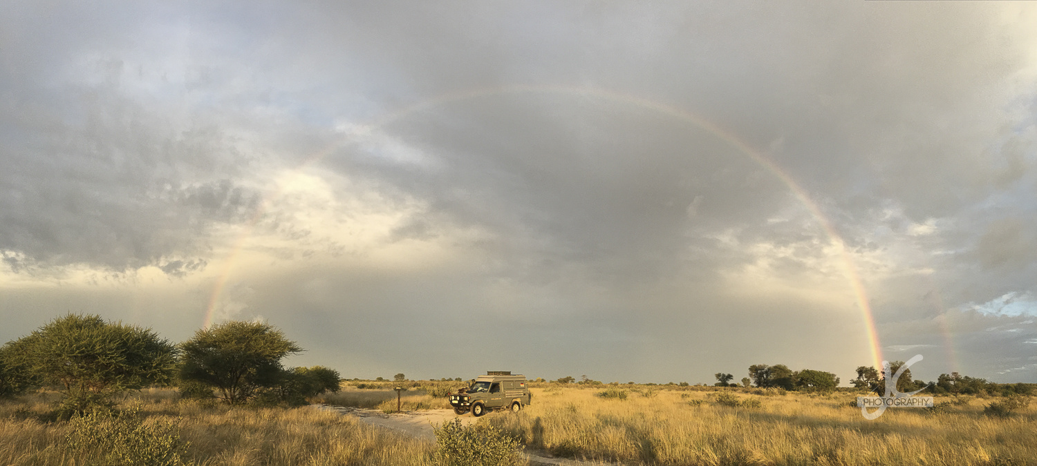 We started this trip in CKGR or the Central Kalahari Game Reserve. It is beautiful this time of the year right after rainy season, since everything is really green. We still had some rain every once in a while which gave us this beautiful rainbow at one point. Because of that it was also still muddy though at some stretches, as you can see on one of the pictures. We had to pull out a friend who got stuck. And every once in a while Jens plays mechanic since there’s some noise or he discovered something at a check up. Luckily he always pays attention in the workshops.
