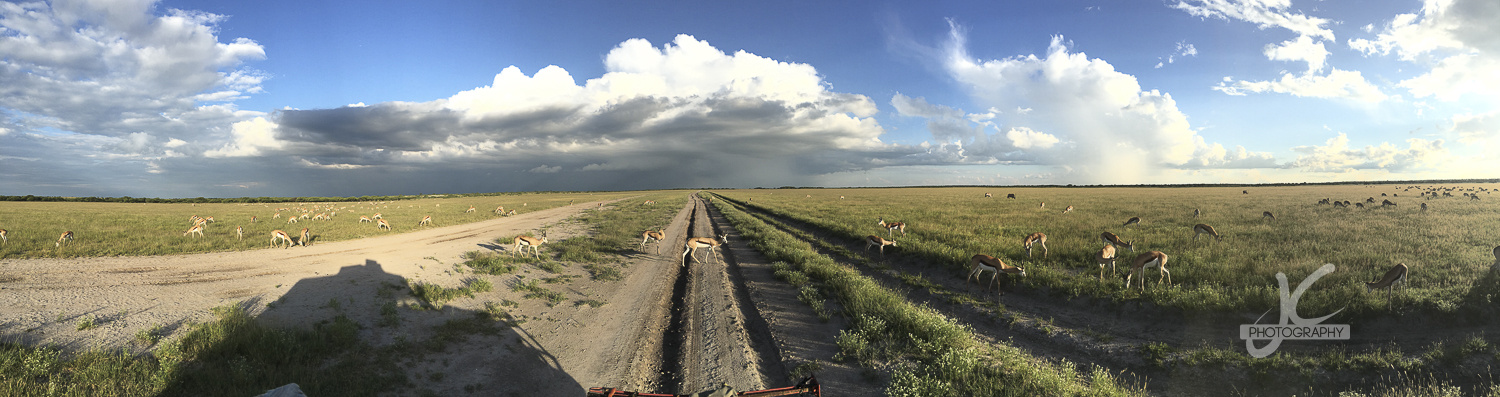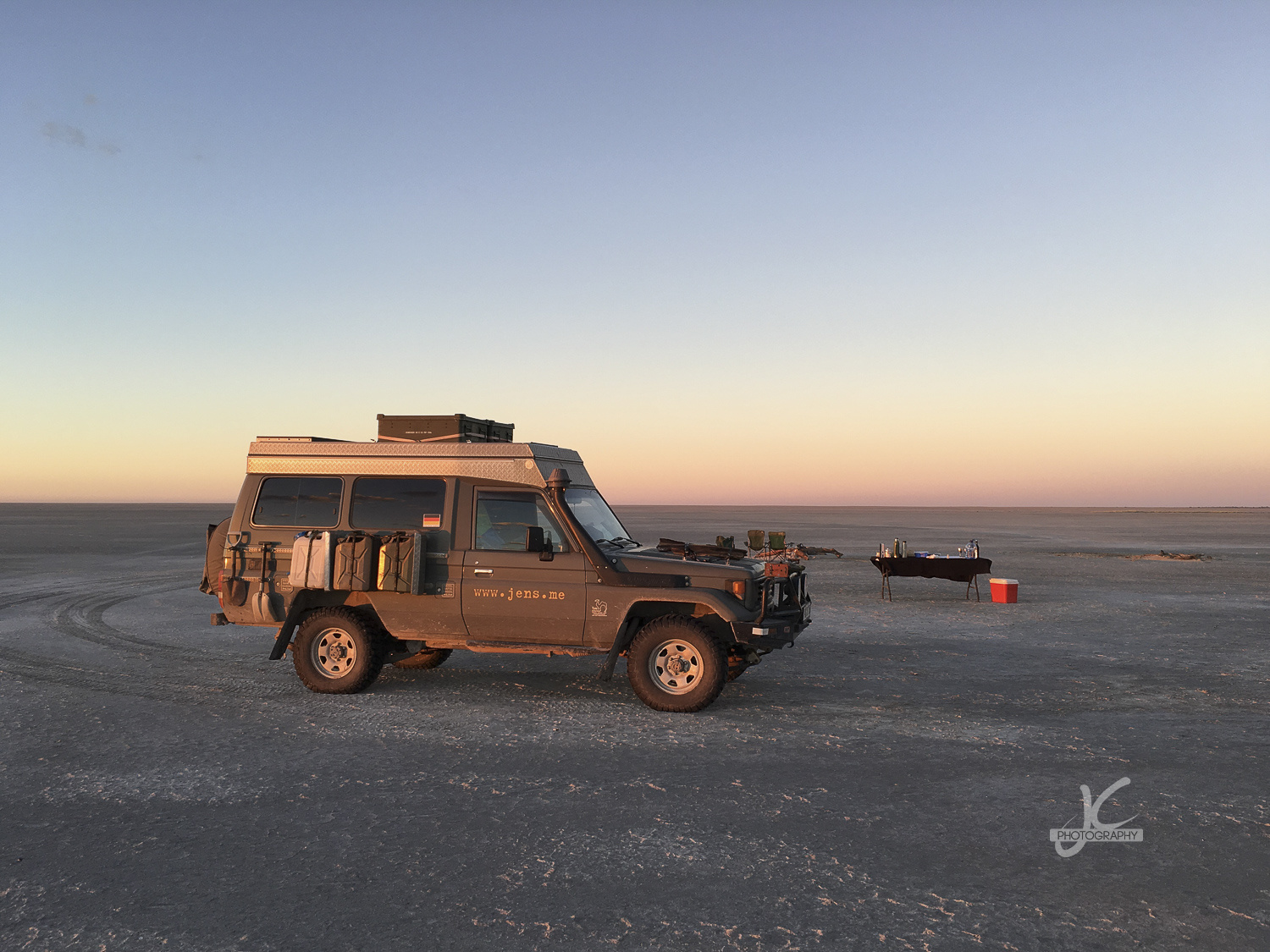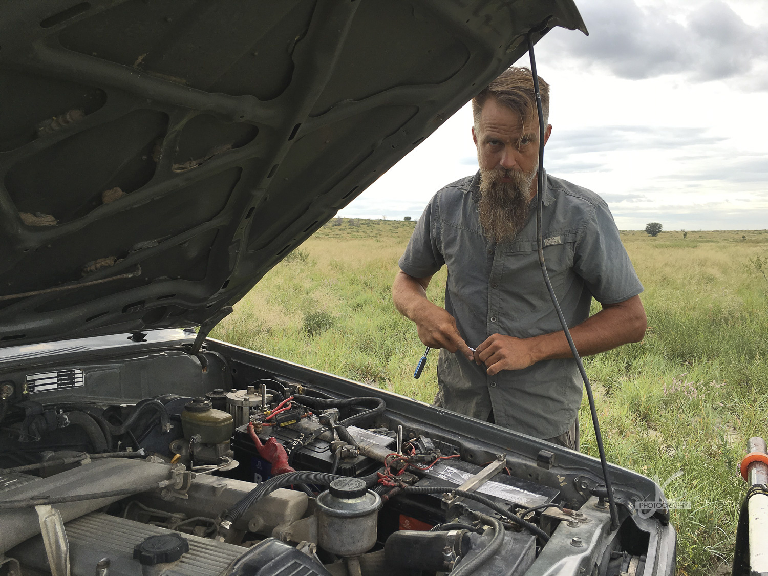 We started this trip in CKGR or the Central Kalahari Game Reserve. It is beautiful this time of the year right after rainy season, since everything is really green. We still had some rain every once in a while which gave us this beautiful rainbow at one point. Because of that it was also still muddy though at some stretches, as you can see on one of the pictures. We had to pull out a friend who got stuck. And every once in a while Jens plays mechanic since there’s some noise or he discovered something at a check up. Luckily he always pays attention in the workshops.