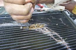 Am nächsten Morgen machten Nick und ich uns erst mal daran, den Kühler auszubauen. Als wir das fast hatten, kamen die Ranger vom Park und wollten unsere Buchungen kontrollieren. Als sie den Schaden am Kühler sahen, sagte der eine, dass er Mechaniker sei und er könnte uns helfen. Die Hilfe nahmen wir gerne an, den zu dem Zeitpunkt hatten wir keine Ahnung, wie man das Riesenloch hier im Busch reparieren sollte. Später stellte sich dann heraus, dass drei Kühlrippen beschädigt waren. Wir legten sie frei, schnitten die beschädigten Stellen der Kühlrippen so weit wie nötig heraus und bogen die Enden so zusammen, dass sie verschlossen waren. Somit fehlen mir am neuen Kühler (zu dem Zeitpunkt drei Tage im Auto eingebaut) drei von circa einhundert Kühlrippen zur vollen Kühlleistung, was nicht mehr ganz so dramatisch ist. Der Kühler war dann schnell wieder eingebaut. Zum Glück hatte ich noch einige Liter Kühlerwasser als Ersatz dabei und wir konnten den Rest der Woche ohne Probleme im Park verbringen. Allerdings entschloss ich mich, danach nicht wie geplant, meine Reise fortzusetzen, sondern fuhr wieder zurück nach Maun um den Kühler noch fachmännisch in der Werkstatt reparieren zu lassen.