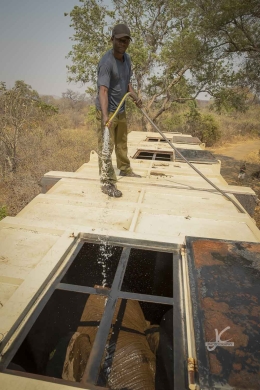 One of them is Pete Clemence. He and his two sons have been taking care of elephants and leading anti-poaching units almost their entire lives. We had a talk with him early in the morning while we were waiting for the elephants to arrive after a long trip. He’s such an interesting guy and only that talk taught me a lot! After some waiting we heard there was a problem with the truck. Something broke and the truck got stuck in a dry riverbed. We decided to drive there and take a look.