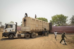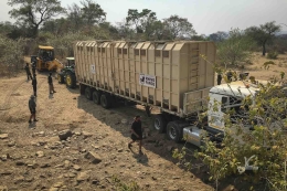 A camera crew of German tv, was waiting there to film the release. They followed the entire relocation, so they were also there when the elephants got captured in Sango. Long days and lots of driving! We told them the truck was on his way and waited with them. After a while it arrived. The next task was to drive as precise as possible to the big ramp built to release the elephants directly into the boma. That took some going back and forth, but finally they decided it was right.