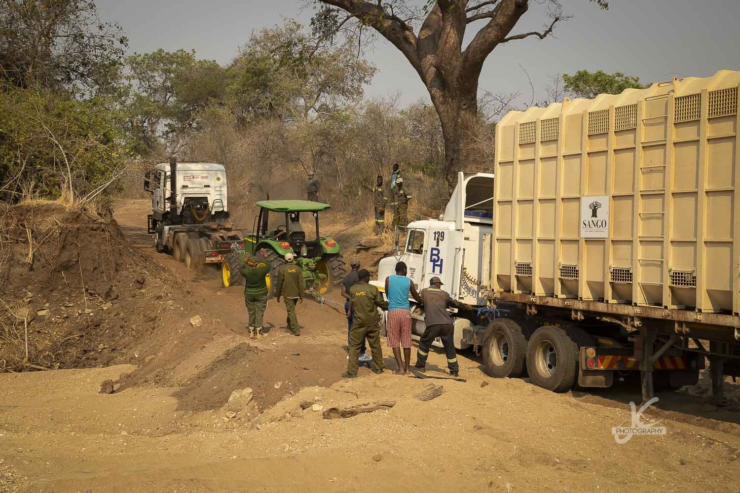 After some driving around we found a huge truck with 9 elephants inside, indeed stuck in the sand. Not only the sand seemed to be the problem, but also the truck itself, so the cabin needed to be replaced. Not an easy thing to do and for sure not in a dry riverbed with 9 hot elephants. Nevertheless everyone worked together and went for it. A tractor tried to pull the cabin out, but didn’t manage, then another truck arrived and with some help of the truck and the tractor they managed after a while to get the cabin off and change it.