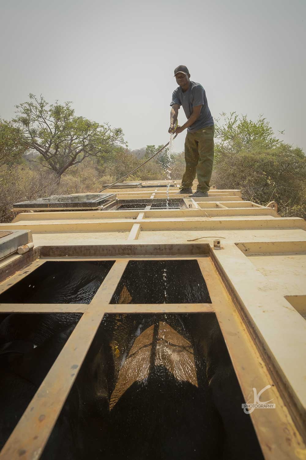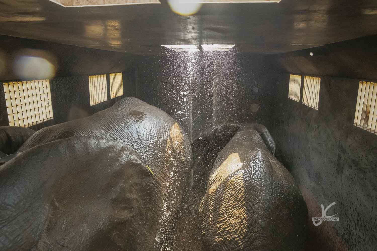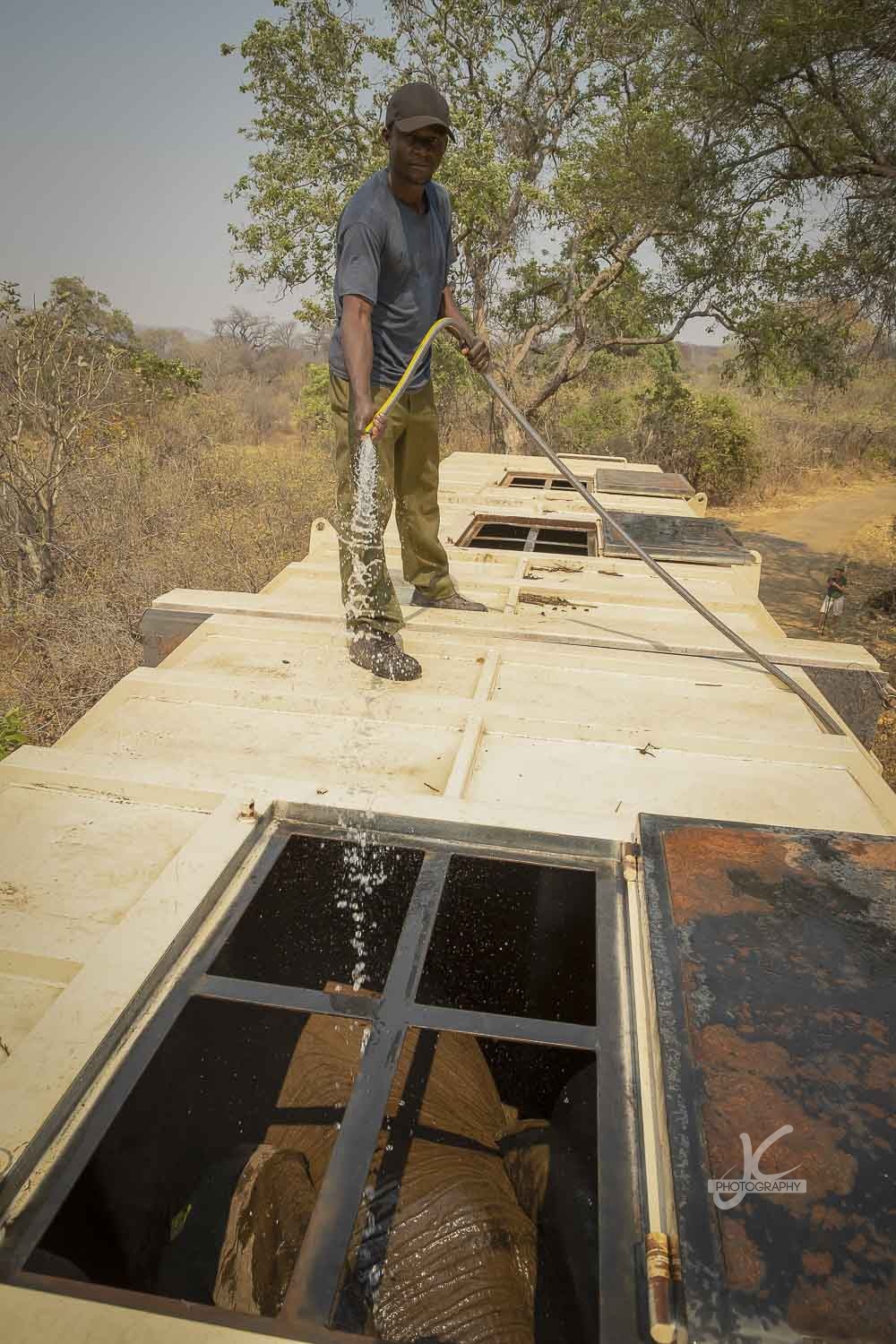 The elephants had been there now for a while, so they started to get a little restless and thirsty. The crew decided to cool them down a bit first before they would leave for the last piece of the journey to release them. Jens decided to take a look inside. Amazing view, don’t you think?