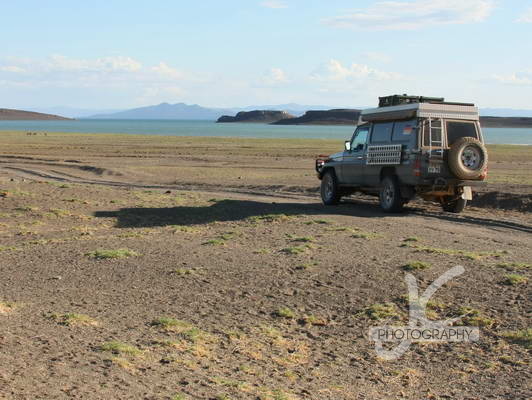 Hier war keine Kontrolle mehr, die Wege wurden immer schlechter und ich entschied mich für eine Strecke vom See (der jetzt auf der kenianischen Seite anfing) weg. Bei meiner letzten Tour war der Nordteil trotz „Nichtregenzeit“ matschig und dieses Risiko wollte ich mit nur einem Auto nicht eingehen! Über North Horr fuhren wir nach Loiylongolani, Wieder zum Turkana See in die katholische Mission. Den Tip haben wir von einer Schwester in North Horr bekommen. In Loiylongolani gibt es wegen heisser Quellen ein kleines Pool in der Mission, was für ein Luxus hier „am Ende der Welt“.