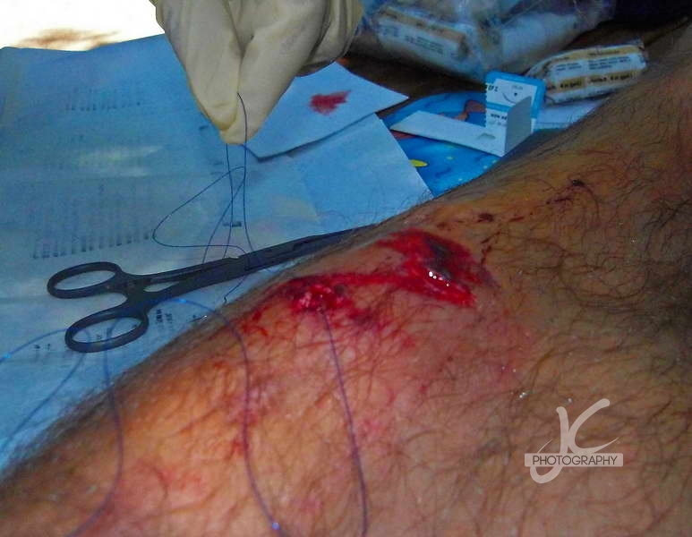 Tausend Sachen gehen einem da durch den Kopf. Ich hab mich ja zum Glück vor der Reise mit einem Erste-Hilfe-Kurs für Langzeitreisende vorbereitet und im Auto hab ich ein Näh-Kit für so Notfälle dabei und wir übten sogar das Nähen einer Wunde an einem Schweinfuß, aber dass es nun meiner sein muß!!! … und wie war das nochmal mit den Sterilisieren??? Wie verknotet man nochmal den Faden???