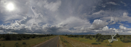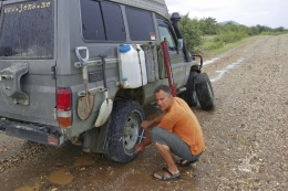 Sobald es hell wurde, sondierten wir die Lage. Der Regen hatte zum Glück aufgehört, aber überall um uns herum waren dunkelste Wolken am Himmel und man sah viel Blitze. Im Flussbett war schon fast knietief das Wasser, wo es am Vortag noch staubtrocken war! Das Frühstück entfiel und wir fuhren sofort los. Unsere Befürchtung war, dass das Wasser noch mehr steigt und wir für Tage eingeschlossen sind!