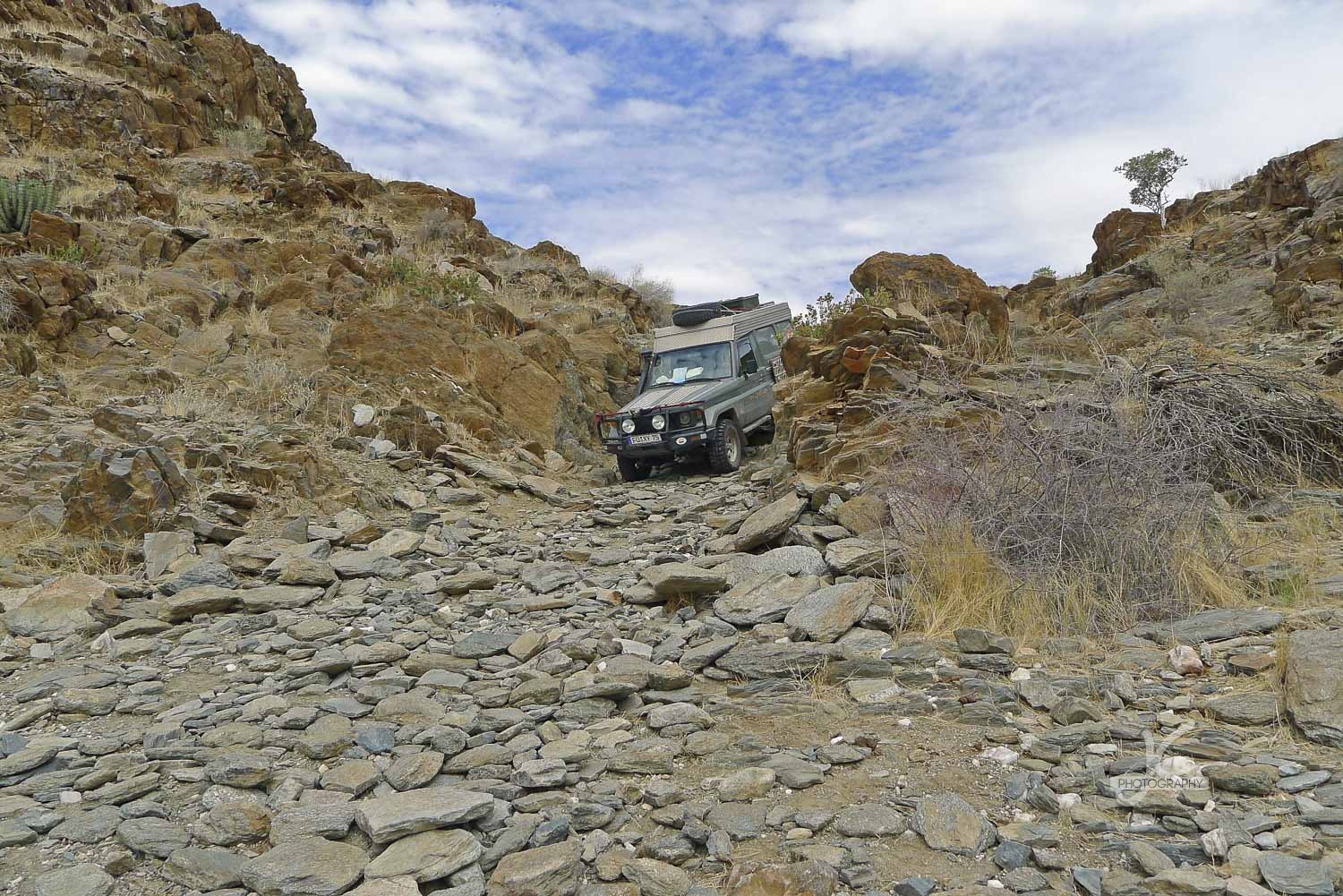In Twyfelfontain konnte ich dann wenigstens die Reifen flicken lassen. Weiter ging es dann über den Palmwag-Concession-Weg in den Norden. Es geht in dieser Gegend größtenteils durch ausgetrocknete Flusstäler in den Norden. Dort sollte man sich vorher informieren, ob die Durchfahrt möglich ist. Letztes Jahr gab es außergewöhnlich viel Regen und eine Durchfahrt durch diese Gegend war nicht möglich. In diesem Jahr hat es viel weniger geregnet und man versicherte uns, dass das Flussbett absolut trocken sei! Allerdings sollte man auch dann nicht im Flussbett campen! Wir fuhren durch atemberaubende Landschaften und suchten uns abends einen schönen Platz zum Übernachten auf einer Anhöhe.