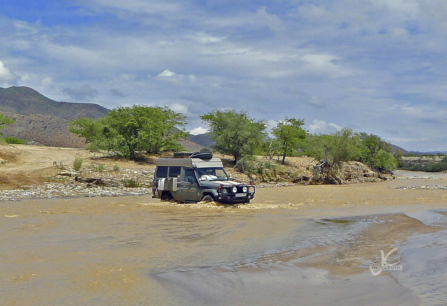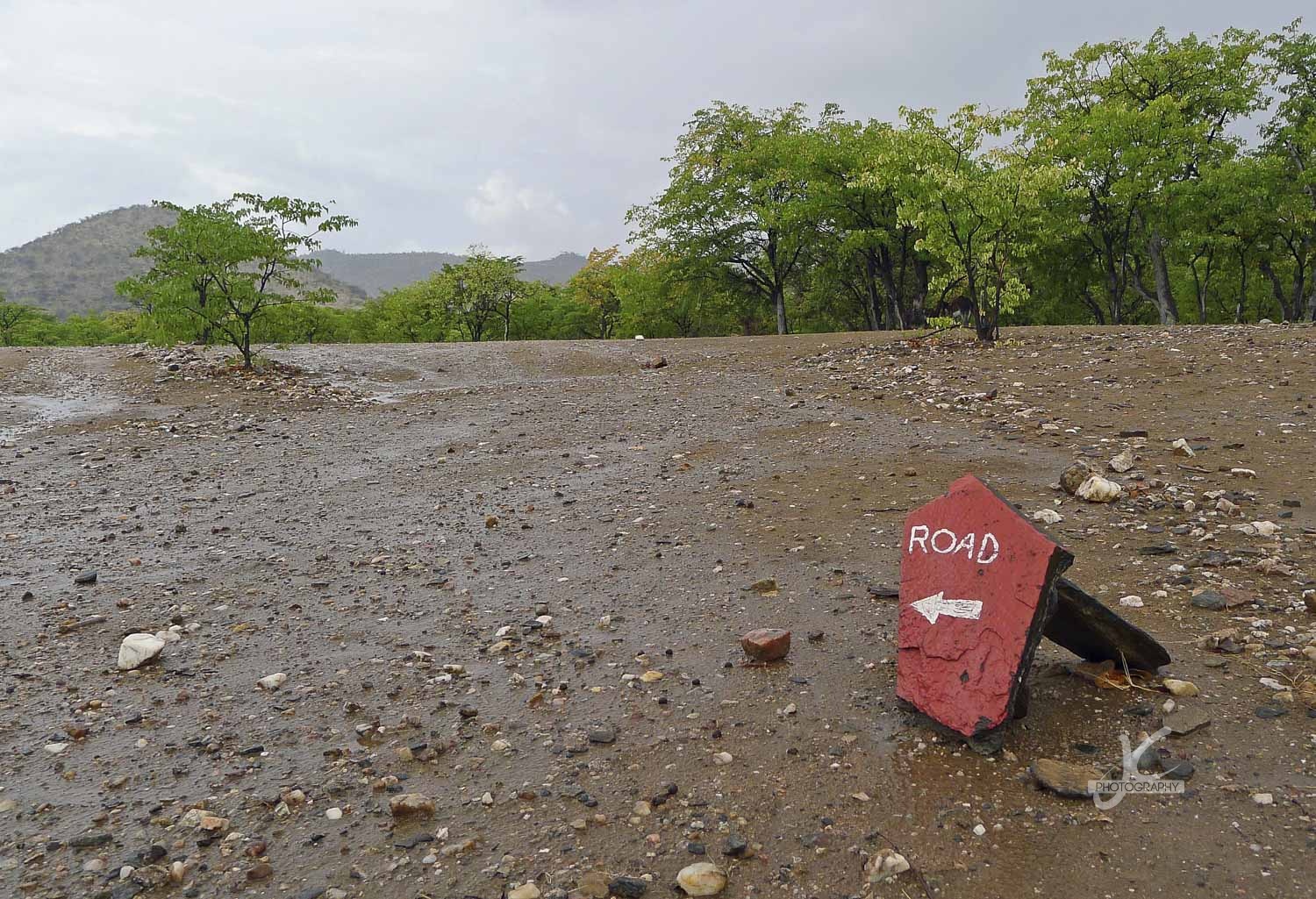 Sobald es hell wurde, sondierten wir die Lage. Der Regen hatte zum Glück aufgehört, aber überall um uns herum waren dunkelste Wolken am Himmel und man sah viel Blitze. Im Flussbett war schon fast knietief das Wasser, wo es am Vortag noch staubtrocken war! Das Frühstück entfiel und wir fuhren sofort los. Unsere Befürchtung war, dass das Wasser noch mehr steigt und wir für Tage eingeschlossen sind!