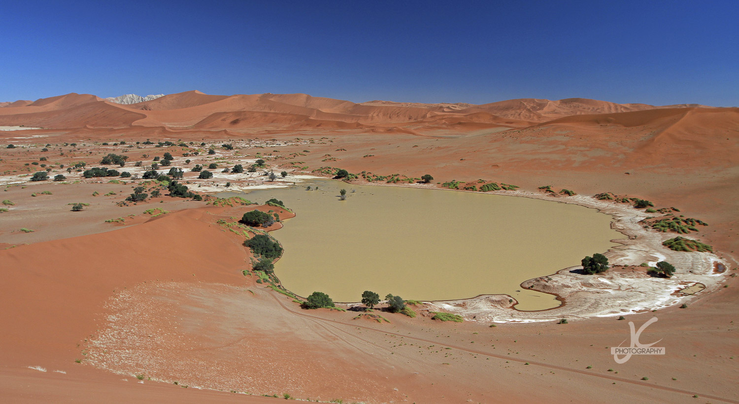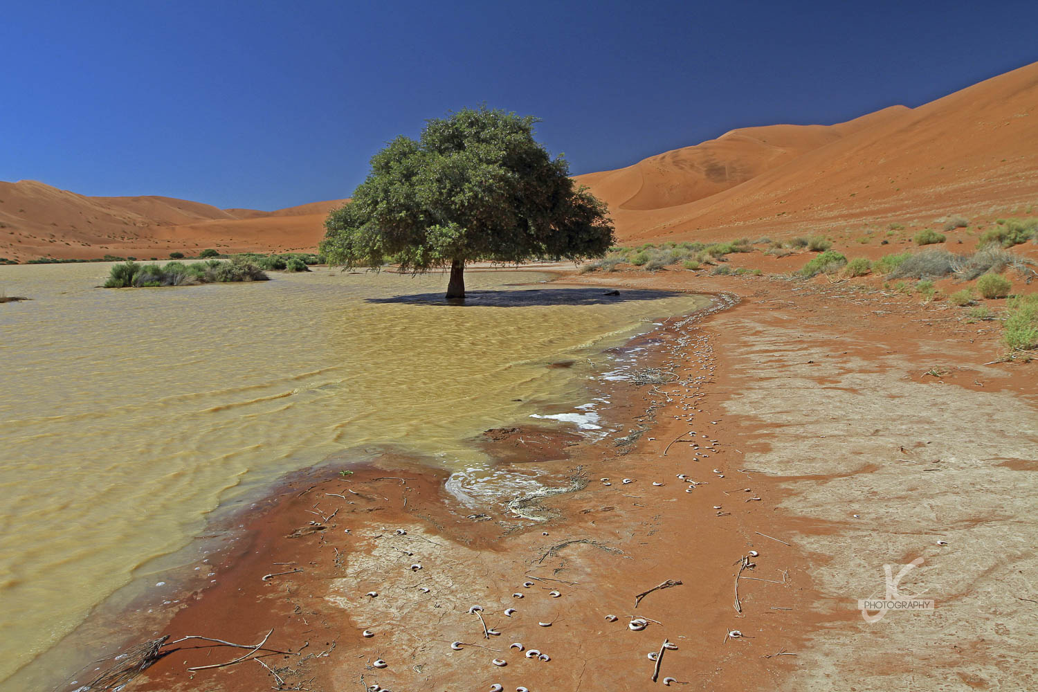 Zurück in Swakopmund erfuhren wir zufällig, dass es in Sossusvlei ein paar Tage vorher geregnet hatte. Das ist eigentlich sehr selten und kommt nur alle paar Jahre vor. So änderten wir unsere Reisepläne und fuhren zu den „Dünen im Wasser“! (siehe Bilder)