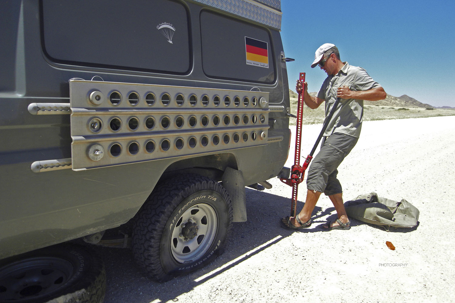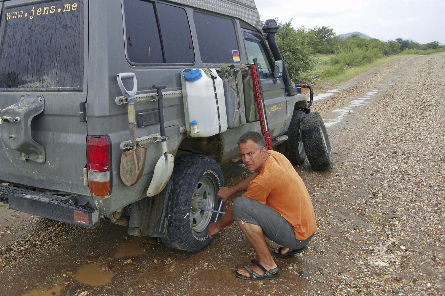 Nachdem unsere Vorräte aufgefüllt waren, fuhren wir am nächsten Tag weiter in den sehr einsamen Nordwesten! Allerdings kamen wir nicht weit und circa 50 km nach Opuwo hatten wir wieder einen platten Reifen. Die Nerven lagen blank 🙁 Dies hat uns leider veranlasst, wieder nach Opuwo zu fahren. Wir entschlossen uns, neue Reifen zu kaufen. Nach den Erfahrungen und den vielen Platten, der letzten Tage, konnte mich Magda überreden 😉