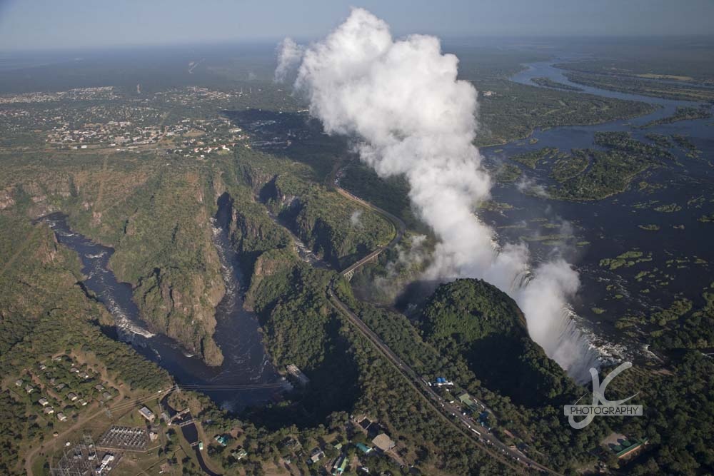 Anfang April verbrachten wir mit Stuart in Victoria Falls. Zu dieser Zeit führt der Sambesi-Fluss das meiste Wasser und man sieht den Sprühnebel schon von weit weg. Die Vogelperspektive ist die beste Gelegenheit, sich dieses Naturspektakel anzusehen. So entschieden wir uns für einen Helikopterflug und waren von den Ausblicken schwer beeindruckt. Am selben Tag liefen wir noch an den Wasserfällen entlang. Eine Regenschutzkleidung fanden wir ziemlich uncool und lehnten sie entschieden ab. Wie erwartet dauerte es nicht lange, bis wir bis auf die Knochen nass waren. Ans Fotografieren war dabei gar nicht zu denken.