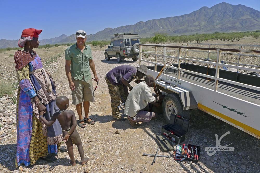 Auf dem Weg zum Camp am Kunene-Fluss sahen wir ein Pannenfahrzeug und hielten an, um zu helfen. Der Fahrer war mit einigen interessanten Fahrgästen unterwegs, siehe Foto.
