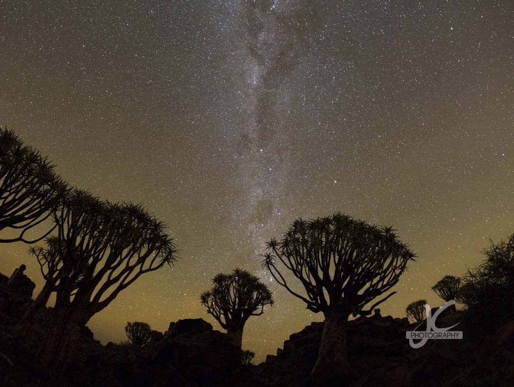Mittlerweile neigte sich unsere Zeit in Namibia zu Ende. Die letzten Tage verbrachten wir in der Nähe von Keetmanshoop. Dort fand man Versteinerungen von Sauriern, deren Alter auf auf 270 Mio. Jahre datiert ist. Außerdem wächst da ein spektakulärer Köcherbaumwald. Es war Neumond und somit bestand eine gute Chance, Sternbilder zu machen. Dies klingt ja einfacher, als es tatsächlich war. Technisches Wissen war gefragt: wie findet man den wahren Süden, welche Kameraeinstellungen nimmt man vor? Außerdem: wo stellt man die Kamera am besten auf und wie findet man sie wieder in der totalen Dunkelheit? In fast schlaflosen Nächten fand Jens Antworten auf all diese Fragen. Die Resultate können sich ja sehen lassen!