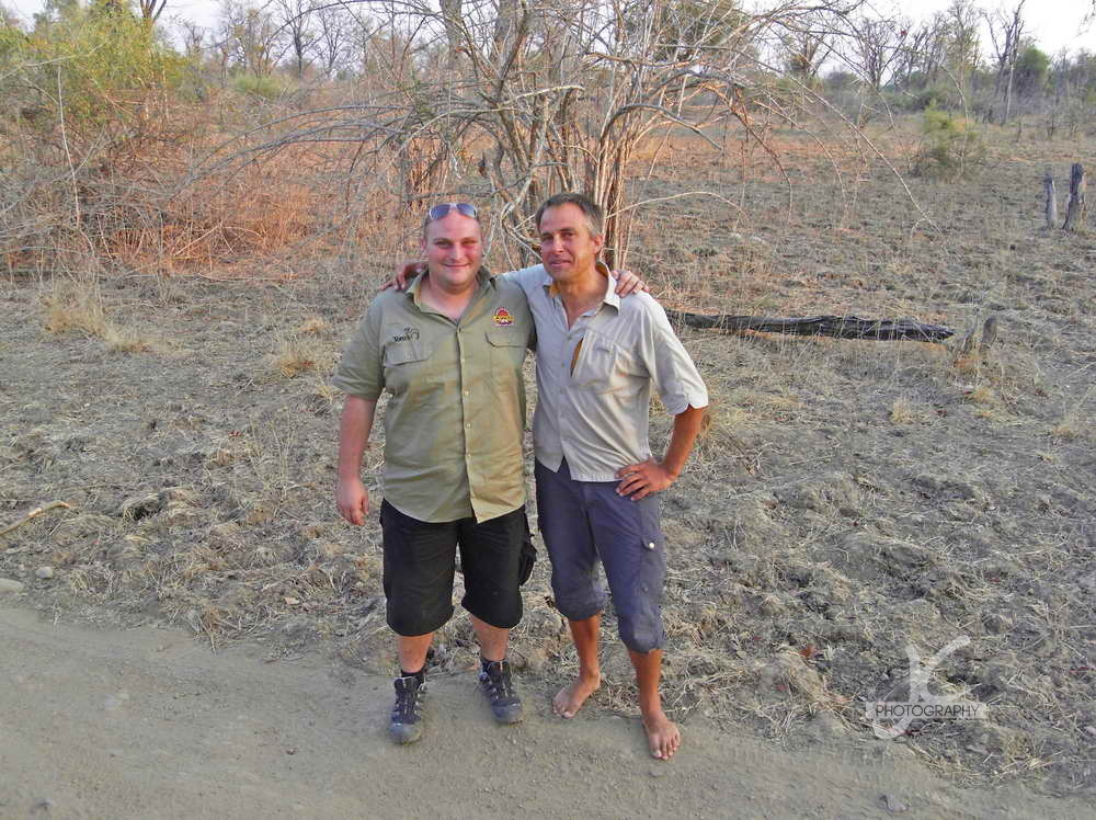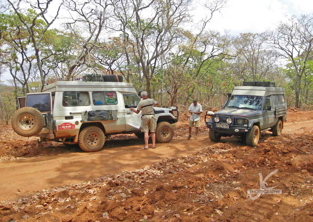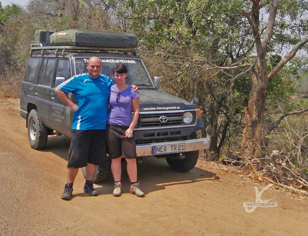 Am nächsten Tag, spät nachmittags, ich war gerade auf der Fahrt aus dem Park, kommt mir ein offenes Safariauto mit einigen Touristen auf den Sitzbänken, entgegen. Im langsamen vorbeifahren schau ich rüber zu den Touris und denk mir noch, dass ich das Gesicht doch kenne. Und er schaut auch so komisch rüber zu mir. Ich bremse, er scheint auch dem Fahrer zu signalisieren, dass er anhalten soll. Und tatsächlich, steht mir der Mirco gegenüber der mit Freundin Verena in Sambia seinen Urlaub verbringt. Mirco ist der Werkstattleiter, wo ich mein Auto vor zwei Jahren gekauft habe. Zufälle gibts! Am nächsten Tag haben wir uns nochmal getroffen und wir haben Infos ausgetauscht. Von Ihm bekam ich den Tip einer guten Werkstatt im Luambe Nationalpark. Da an meinem Auto ein paar Kleinigkeiten 🙂 nicht mehr ganz funktioniereten, entschloss ich mich, am nächsten Tag dort hin zu fahren. Dort also ein Werkstatt-Tag ohne vom Park viel gesehen zu haben. Am nächsten Tag im Transit durch den North Luangwa Nationalpark. Auf dem Weg nach außen kommt mir ein Fahrzeug entgegen. Das erste Fahrzeug seit zwei Tagen, deutsches Nummernschild. Wir halten beide an und als der Fahrer aussteigt, trau ich meinen Augen fast nicht. Steht mir da der Olaf gegenüber. Olaf hab ich vor ziemlich genau zwei Jahren, vor meiner Abreise, in Nürnberg getroffen. Damals haben wir besprochen uns im Iran zu treffen, wo zu der Zeit sein Auto stand. Allerdings habe ich meine Visa zu spät bekommen und so wurde daraus nichts! Und nun sieht man sich wieder. Nach zwei Jahren, jeder auf unterschiedlichen Routen unterwegs. Er reist momentan mit seiner Frau Anita und noch einem Freund. Nach einem Informationsaustausch und dem Beweisfoto fuhren wir in entgegengesetzte Richtungen weiter.