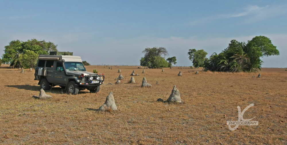 An einen Abend wollte ich grillen. Die Nachbarn hatten noch Feuer an und so hab ich meine Kartoffeln, Süßkartoffeln und eine Zwiebel schon in Alufolie gewickelt und in die Glut gelegt. Das Fleisch war noch abgepackt am Tisch neben der Tomate, die auch erst zum Schluß in die Glut kommt. Ich wollte noch die Bilder der letzten Tage auf meinen Computer sichern und sichten, da hörte ich wie so oft davor, das spritzen und platschen von Wasser … werden wieder Hippos oder Elefanten über den Fluß kommen dachte ich mir. Kurz darauf sah ich einen mittelgroßen Elefanten vielleicht 30 Meter vom Auto … auch nichts besonderes, die Nächte vorher grasten Flußpferde direkt neben dem Auto in der Nacht und in Manapools gingen Elefanten keine fünf Meter von uns vorbei, während Jez und ich grillten. Doch plötzlich stand der Elefant am Auto und Sekunden später vor meinem Tisch, vielleicht zwei Meter vor mir (ich noch sitzend auf der anderen Seite). Dann schleuderte er seinen Rüssel von unten nach oben in die Luft, wie eine abfällige Handbewegung. Sandkörner und kleine Steinchen wurden dabei in die Luft geschleudert und trafen auch mich. Ich klappte ruhig aber schnell den Computer zusammen, griff ihn, stand auf und entfernte mich schnell aber nicht hektisch nach hinten. Dann griff sich der Elefant mit seinen Rüssel die Tomate und führte sie zum Maul und frass sie. Dann kam die Knoblauch-Kräuter-Gewürzmischung dran. Er kaute ein wenig auf der Plastikflasche herum. Aber anscheinend schmeckte sie nicht, denn sie landete auf dem Boden. Dafür griff er sich jetzt mit dem Rüssel das noch abgepackte Fleisch und aß es auf! Dann schwenkte er zum Auto, durchwühlte die Küchenkiste, fand aber nichts weiter. Zum Glück war Zucker und Salz gut verpackt. Irgendwie hat er dann noch die Butterdose zerstört.