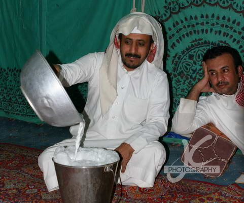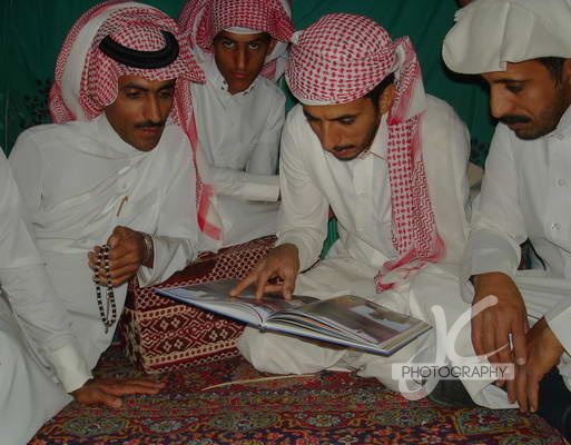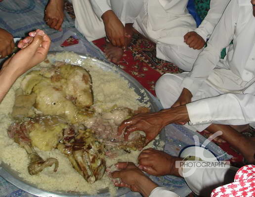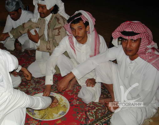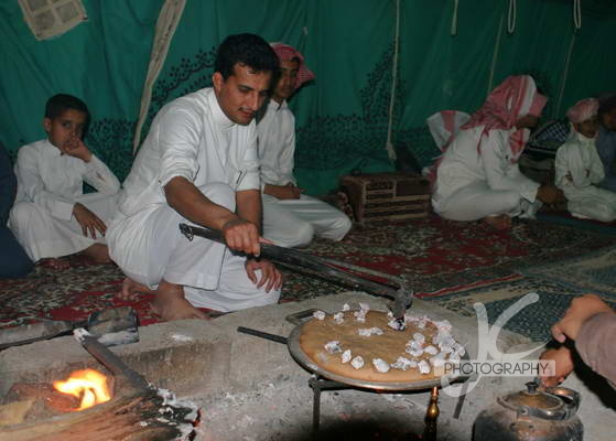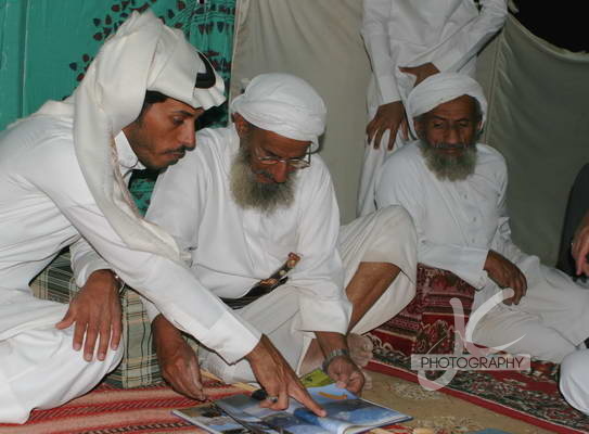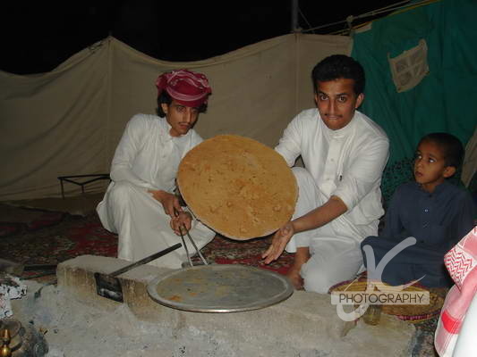Am letzten Abend gab es in großer Runde in einem Beduinenzelt in der Wüste noch Lamm zum Abendessen. Es war ein ständiges kommen und gehen von Männern. Wenn jemand neues kam folgte eine längere Begrüßungszeremonie. Alle standen auf, jeder wurde persönlich mit Nasen- oder Wangenkuss begrüßt, dazu dann die längere Grußformel wo nach dem befinden der Familie, der Kamele usw. gefragt wird. Das zog sich dann ganz schön in die Länge. Da es bestimmt 25 Männer waren, wurden drei große Platten mit je einem Lamm auf Reis und Sosse (siehe Gallery) aufgetragen. Die Frauen waren in einem der Nachbarzelte und bereiteten das Essen zu. Komischerweise wurde das Brot im Männerzelt in der Glut des Lagerfeuers von Männern gebacken. Dort durfte ich als Fremder zwischen den Alten als Ehrengast sitzen. Irgendwann zeigte ich mein Fotobuch. In Trauben versammelten sich die Männer ums Buch. Mehrmals musste ich mehreren Gruppen das Buch zeigen und viel erklären …. es wurde auch viel gefragt. Das mit den Fischen und den Apfelbäumen und Mosten hat sie am meisten fasziniert. Darauf hin hab ich meine eiserne Reserve an Langenzenner/Laubendorfer Apfelsaft geholt, ein 10-Liter Sack, vakuumverpackt! Der wurde dann in großer Runde in kleinen Gläsern und Schalen verteilt. Dann wurde ich auf dem Arm genommen, weil sie meinten, der Saft wäre ja schon Alkohol. Ich erschrak, denn ich hatte selbst noch kein Glas Saft bekommen und dachte schon das der Saft vielleicht die Fahrt und die Hitze nicht überstanden hätte. Und Alkohol ist ja hier strengstens verboten, aber irgendwann lachten alle und klärten mich auf.