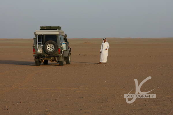 Was für ein Tag, übernachtet im Freien in der Rub-al’Kali, mit Beduinen gefrühstückt und frische Kamelmilch getrunken, dann 500 km mit Polizeischutz durch die Berge bis auf 2500 Meter Höhe (übrigens hat es dort geregnet und es kühlte ab bis auf 15 Grad! Der erste Regentag/Stunde, das letzte Mal Feuchtigkeit von oben war in der Türkei und im Iran vor zwei Monaten Schnee) und abends baden im Roten Meer. Damit ist der Tag aber leider noch nicht zu Ende. Der Polizist kommt zurück und gibt zu erkennen, dass sein Chef ihn zur Wache verpflichtet hat. Dann kommen noch zwei Toyotas, diesmal Militär. Wieder Kontrolle, alle Papiere, Diskusionen, Telefonate und ich darf bleiben. Die Soldaten bringen mir später noch Abendessen, das ich aber ablehne, hatte in der zwischenzeit schon gegessen.