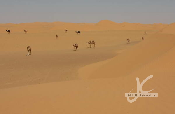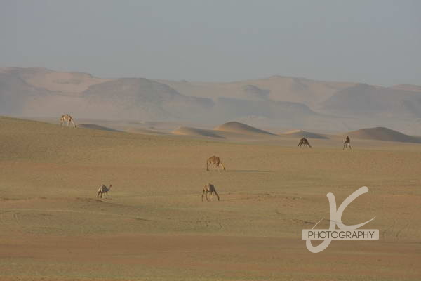 Am nächsten Morgen ein toller Sonnenaufgang und ich sehe erst mal, wo ich bin. Um uns herum nur noch Sand und Dünen. Dazwischen sieht man in der Ferne immer wieder Kamelherden und Zelte von Beduinen. Aber was ich auch feststelle, die Wüste hat hier einen grünen Flaum von Gräsern. Mir wird erklärt, dass die Gegend das Glück hatte, dass es innerhalb von zwei Wochen zweimal regnete. Nun spriesst das Grass in den Ebenen und die Beduinen kommen mit ihren Kamelen von weit her um ihre Tiere zu füttern. So wie ich die Wüste hier sehe, erklärt man mir, ist es eine Ausnahme und man zeigt mir Bilder von der Gegend auf der man kein Grass weit und breit sieht. Vor ein paar Jahren hat es hier acht Jahre keinen Regen gegeben!