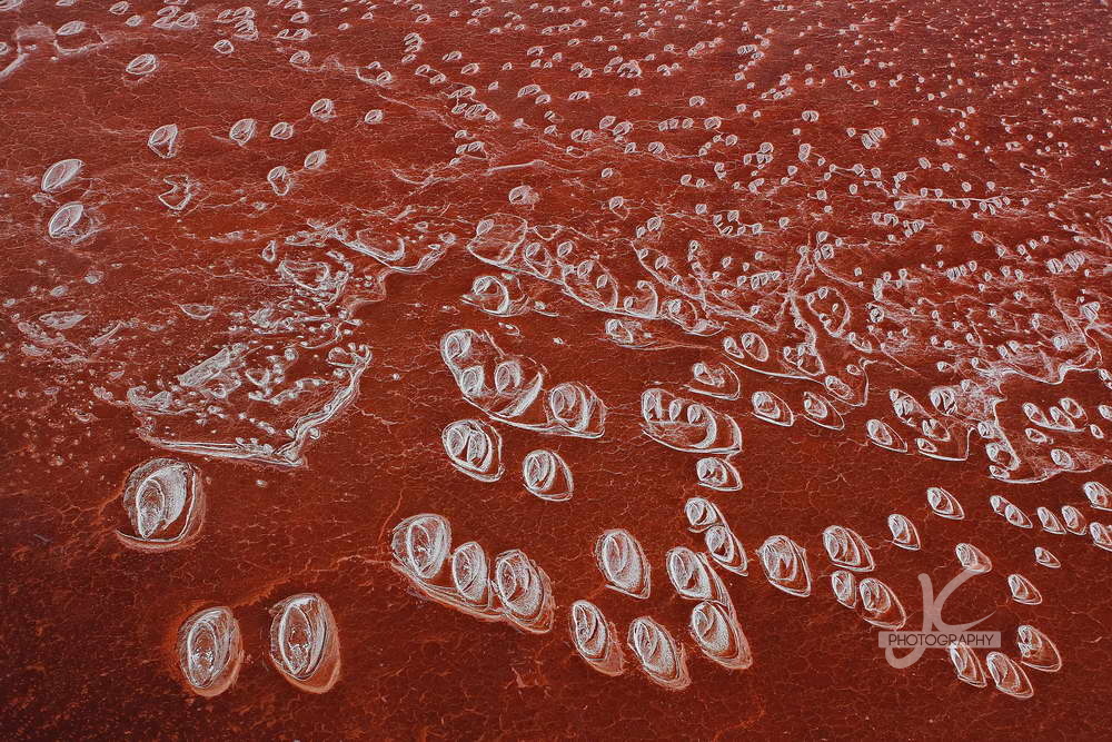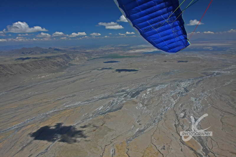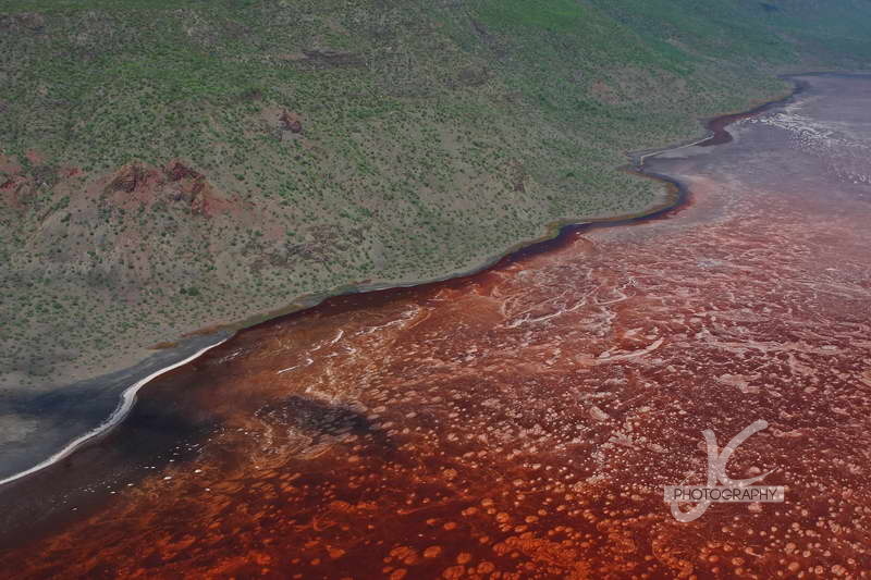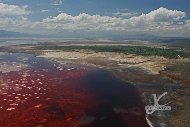 Am folgenden Tag starteten wir (Edi und ich) schon früh, um am See zu der Stelle zukommen, wo die Natronlauge durch Algen das Wasser rot färbt. Vorbei an Flamingos, Pelikanen und viele kleine Dörfer fuhren wir über 50 km auf sehr schlechter Strecke am See entlang. Dort suchten wir dann lange nach einem geeigneten Startplatz und ich musste Edi natürlich erst mal erklären, worauf es beim Fliegen angkommt. Die Hänge schieden aus, weil es dort zu viele Dornensträucher, Bäume oder/und Felsen gab. Also wieder ein Flachlandstart vom Seeufer weg. Glücklicherweise kam immer wieder mal eine leichte Briese und so baute ich dann irgendwann mal meine Ausrüstüng auf und nach ein paar Versuchen mit wenig Wind, war dann endlich mal eine Phase, wo ich den Schirm rückwärts aufziehen konnte und gut weg starten konnte. Die Aussicht von oben war gigantisch! Was man vom Strand nur schlecht und nur leicht rosa sah, sah von oben ganz anders aus. Fast knallrot schimmerte das Wasser und die Salzablagerungen auf der Wasseroberfläche (das Wasser ist in diesem Teil des Sees nicht tief) glänzten weis! Ich flog ein paar mal hin und her und aus Sicherheitsgründen flog ich nicht zu weit über den See und hielt mich immer im Gleitwinkelbereich zum Strand um notfalls das rettende Ufer bei einem Motoraussetzer zu erreichen! Nach meiner Landung hörte ich ein Flugzeug, dass dann auch einen großen Kreis um uns flog!