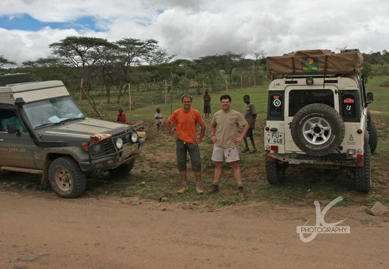 Auf einer längeren Umleitungs-Schotterpiste kam mir dann ein Landrover entgegen mit Dachzelt. Wenn man so wie ich reist, schaut man halt auf solche Sachen. Es könnten ja andere Reisende sein! Und tatsächlich, kein kenianisches Nummernschild und dann denk ich, trifft mich der Schlag, das ist ja ein Fürther Nummernschild!!! Und das Auto ist doch der Landrover vom Stephan! Er muß sich das gleiche gedacht haben, denn gleich nachdem wir aneinander vorbei gefahren sind, bremsten wir ab, fuhren an die Seite und mit riesiger Freude und lachenden Gesichtern kamen mir Margit und Stephan entgegen! Wie schreibe ich dass jetzt in diesem Blog. Mit Stephan bin ich über ein paar Ecken verwandt. Mama wird mich sicherlich im Blog noch korrigieren, aber wir haben den gleichen Ur-Ur- oder Ur-Ur-Urgroßvater! Wir tauschten natürlich noch viele Reiseinformationen aus, machten ein paar Erinnerungsphotos und dann ging es auch schon wieder weiter. Margit und Stephan wollen an den Tag noch nach Arusha/Tansania und ich nach Nairobi!