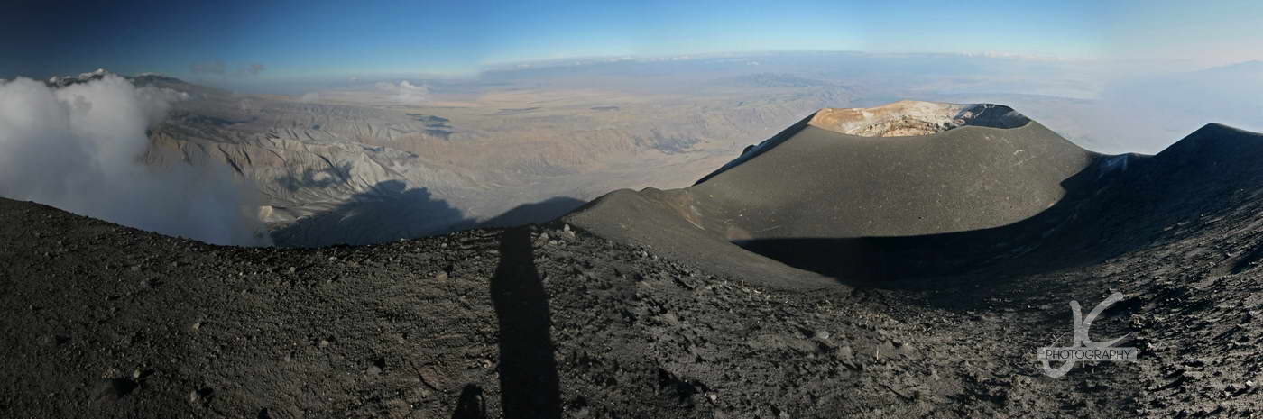 Edi kam mit meiner Gleitschirmausrüstung auch am Ende seiner Kräfte über zwei Stunden nach mir am Gipfel an und legte sich erst mal vollkommen erschöpft auf den Boden. An fliegen war nicht zu denken, zuviel Wolken zogen um den Gipfel und oft war der Wind viel zu heftig. Ich suchte schon mal nach einem möglichen Startplatz. Dort legten wir uns dann auf den Boden, aßen unsere Essensvorräte und tranken die letzten Wasserreserven und warteten darauf, dass die Wolken mal aufreisen. Nach meinen Beobachtungen des letzten Tages war der Gipfel mittags Wolkenfrei. Und tatsächlich, um kurz nach elf vormittags konnte man immer öfter ins Tal und in die Ebene blicken. Wir besprachen uns noch, was zu tun ist, wo man sich wieder trifft und bei einem der nächsten guten Phasen, startete ich. Allerdings hatte ich keine Ahnung wie das Fliegen an einem Vulkan ist und wie sich die Thermik verhält! In der Luft merkte ich schnell, dass es kein einfacher Gleitflug werden würde und ich wurde ziemlich durchgeschüttelt. Ich verzichtete dann auch, mit aller Gewalt am Hang oder unter irgendwelchen vorbeiziehenden Wolken nach Thermik zu suchen und konzentrierte mich relativ bald, in der Nähe meines Autos zu landen. Allerdings war es mir am Fuße des Vulkans, wo mein Auto stand, zu leegefährdet und ich zog es vor, weiter außen in der Ebene zu landen. Von dort mußte ich dann knapp zwei Kilomter mit der Gleitschirmausrüstung in der heißesten Mittagshitze (knapp über 40 Grad) im Vulkanstaub zum Auto laufen. Völlig fertig kam ich dort an, wartete gedultig im Schatten auf Edi. Der mußte ja noch runter laufen und war heilfroh, dass ich geflogen bin, sonst hätte er den Gleitschirm wieder mit runter schleppen dürfen! Dann eine Stunde später kam er zum Auto. Immernoch hatte er seinen Pullover und die Wollmütze an. Schon bei dem Anblick bekam ich einen Hitzschlag! Den Rest des Tages regenerierte ich mich am Campingplatz und schickte Edi wieder zum Einkaufen 🙂