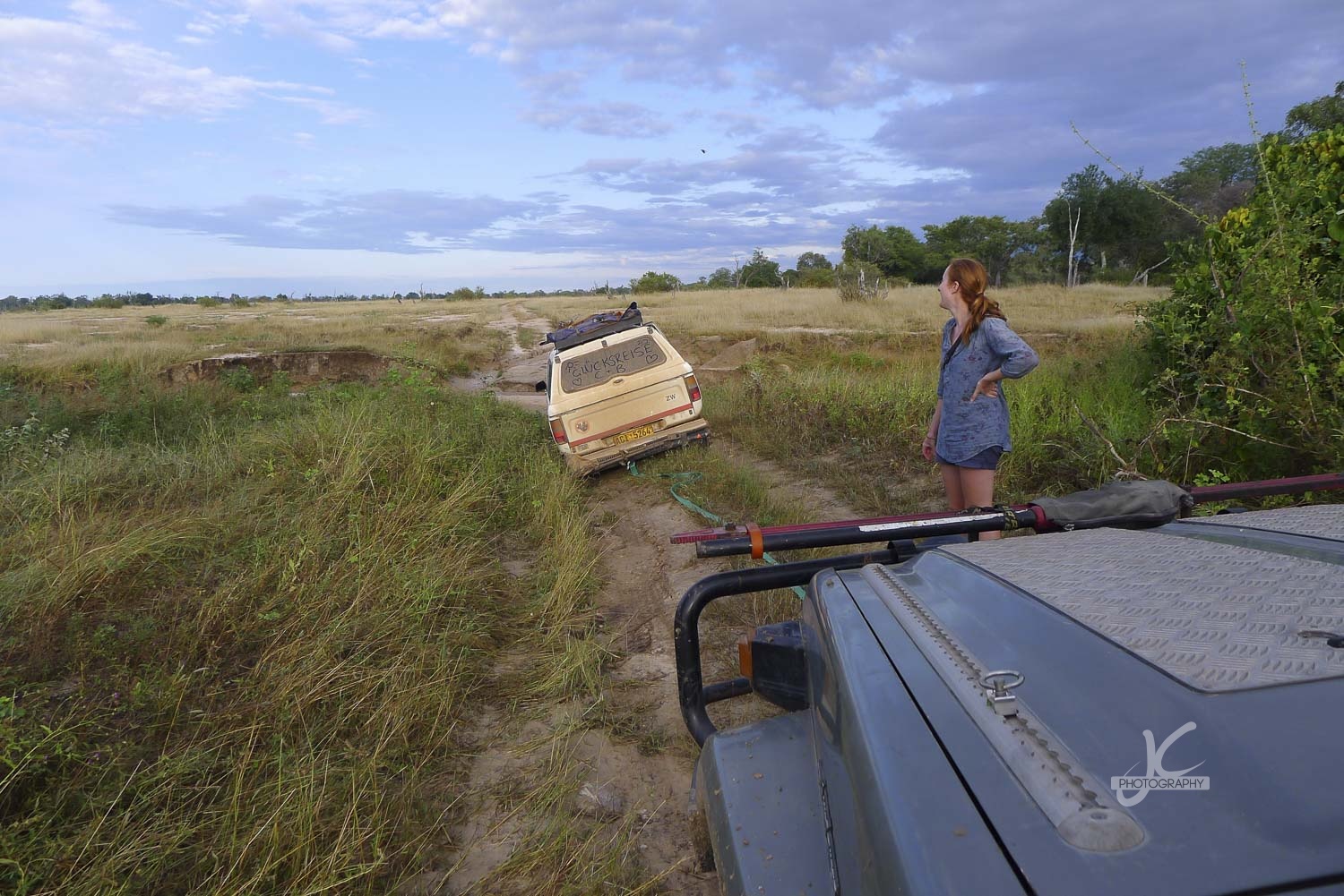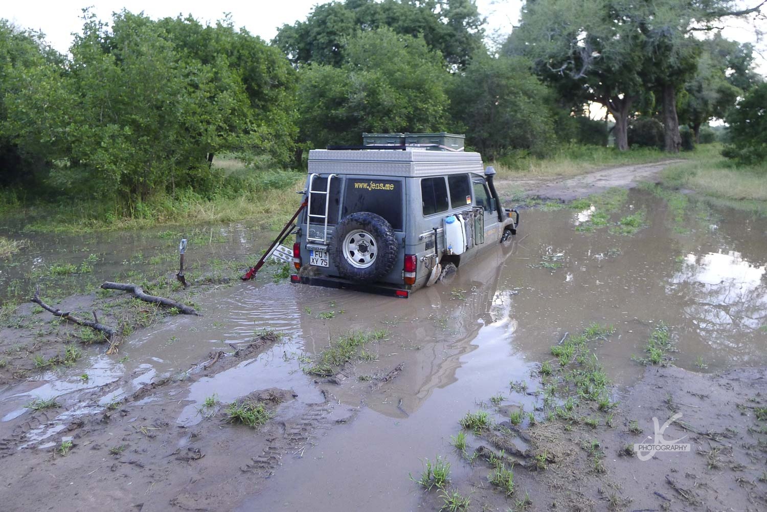Am späten Nachmittag dann mein erster „Game-Drive“. Es war überall sehr sehr schlammig und da passierte es. In der Sekunde, wo das Auto mit der Karosserie aufsitzt, weisst du, du steckst fest. Ein paar versuche noch mit Low Gear, aber hoffnungslos. Die Kiste steckt fest! Und das eine halbe Stunde vor dem Sonnenuntergang!! (kurz nach Sonnenuntergang sollte man im Camp sein)