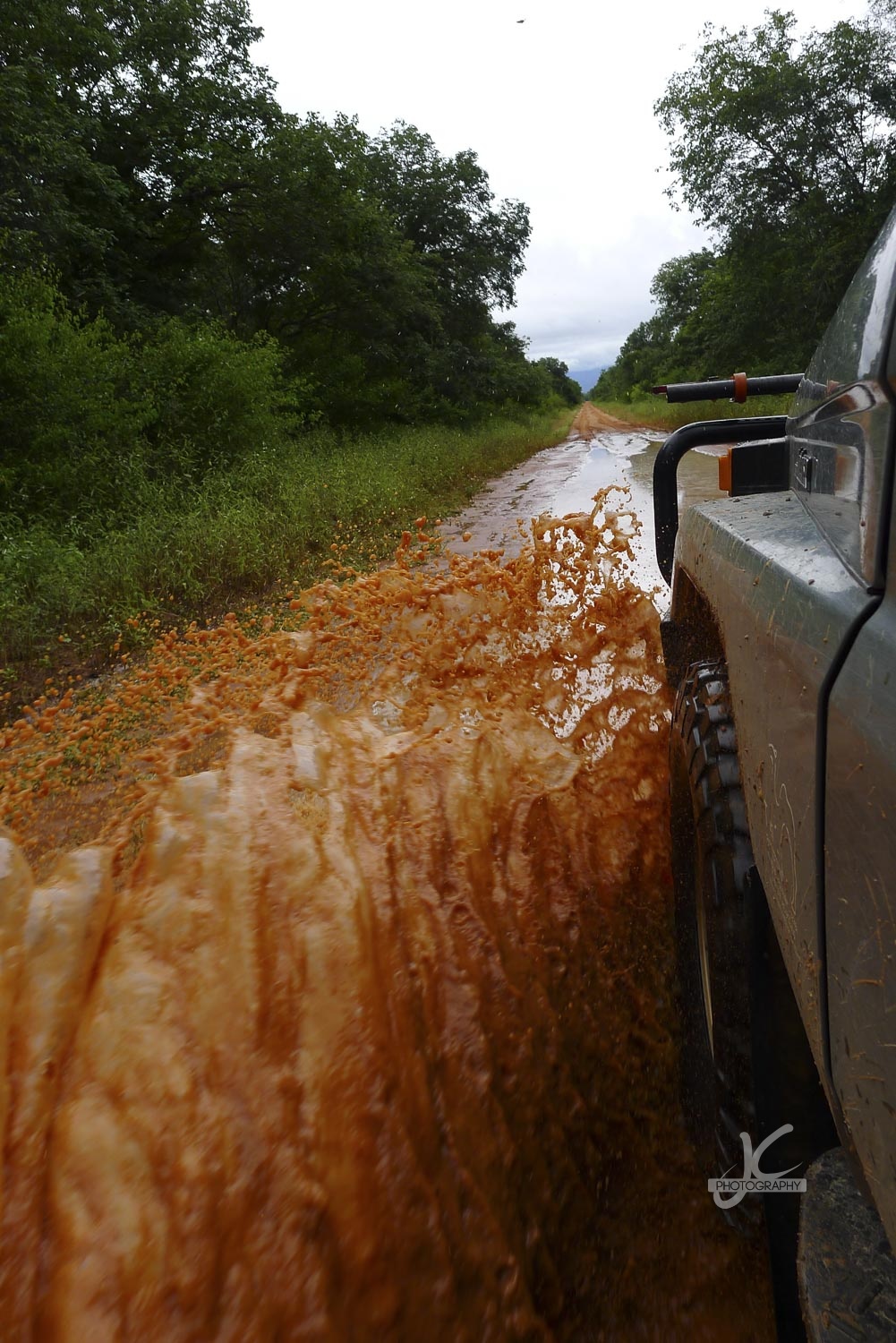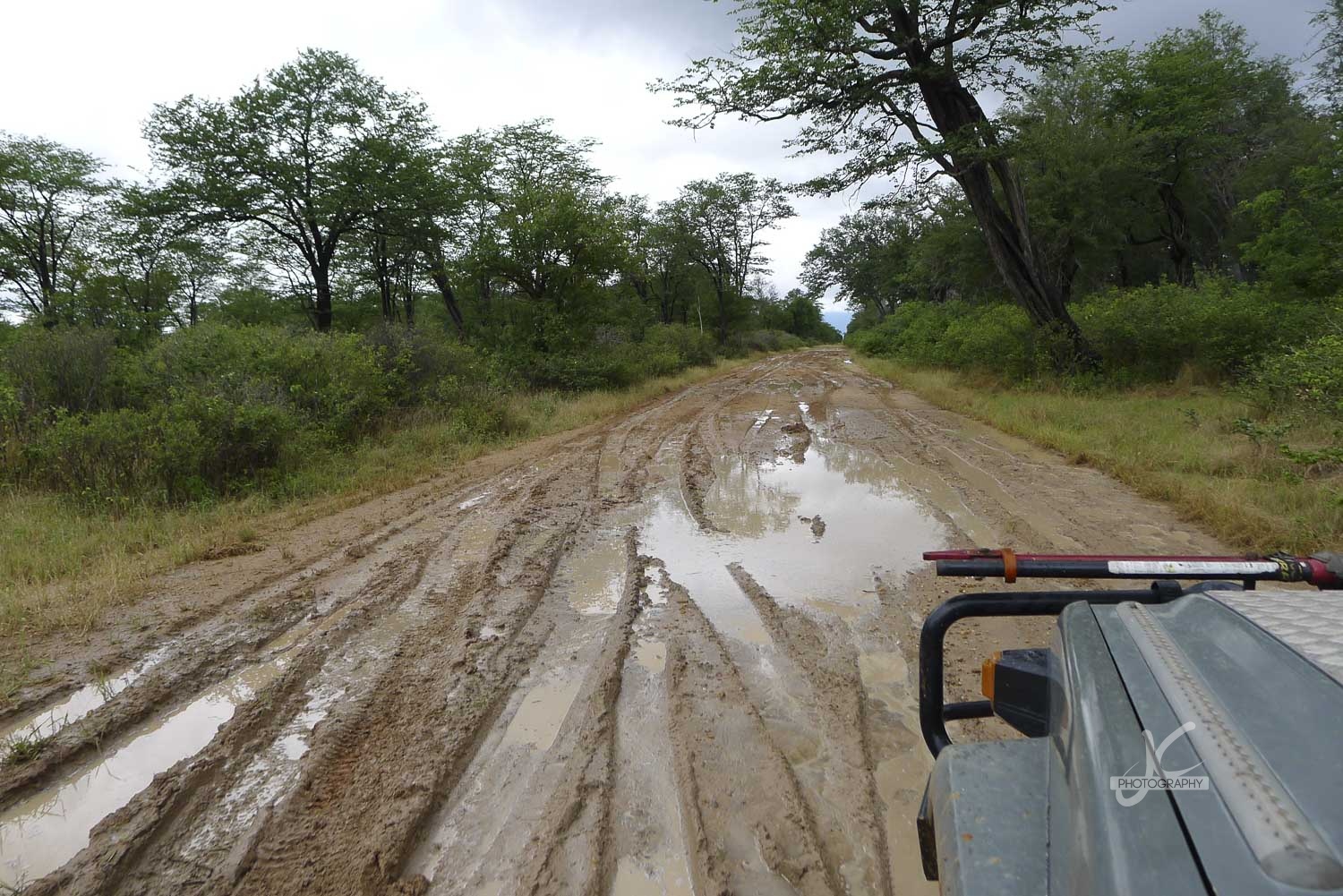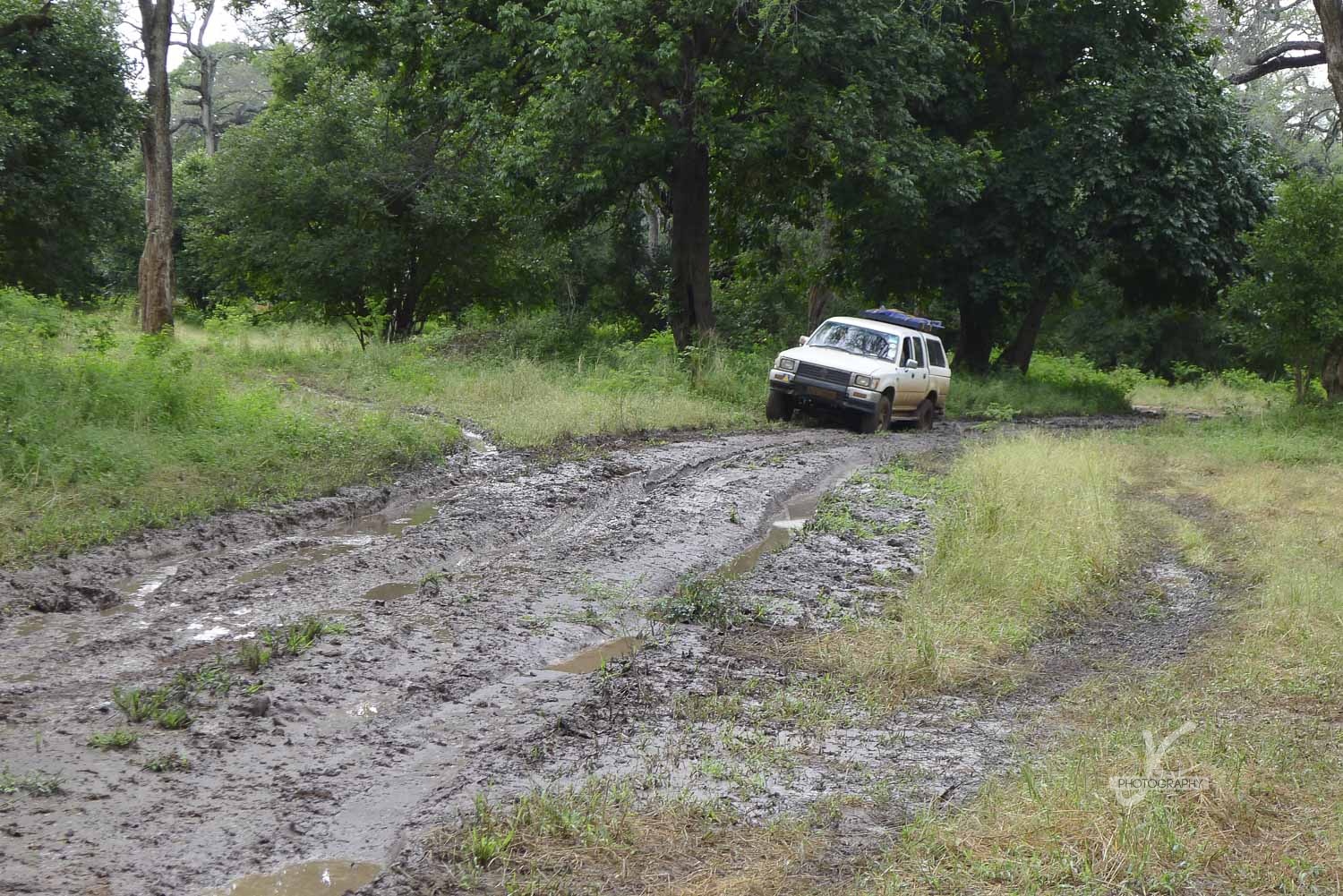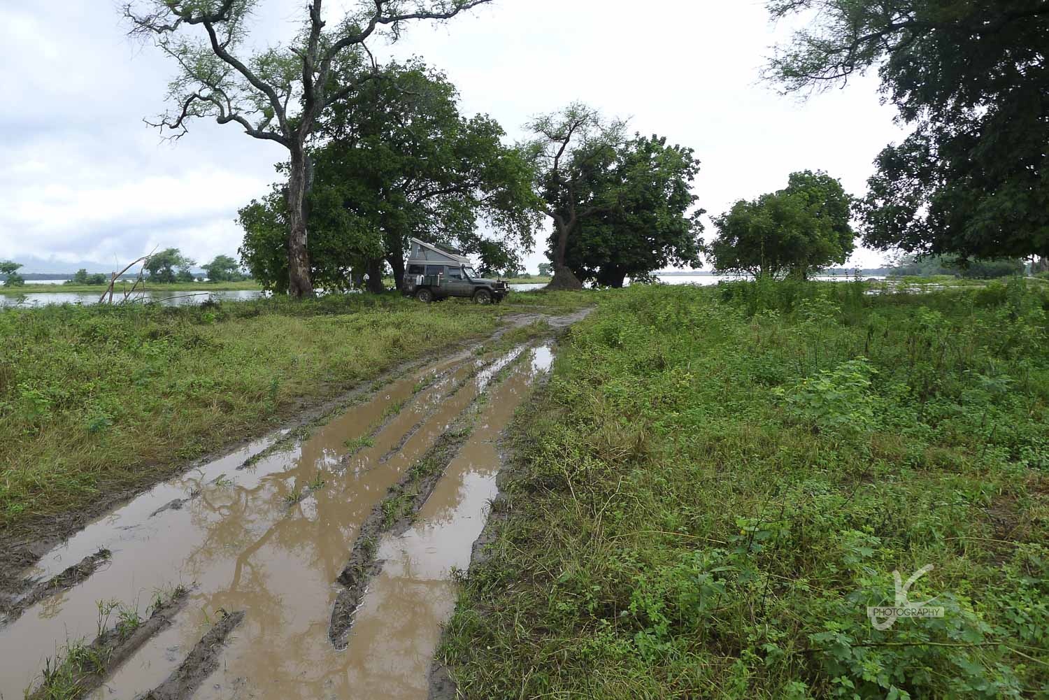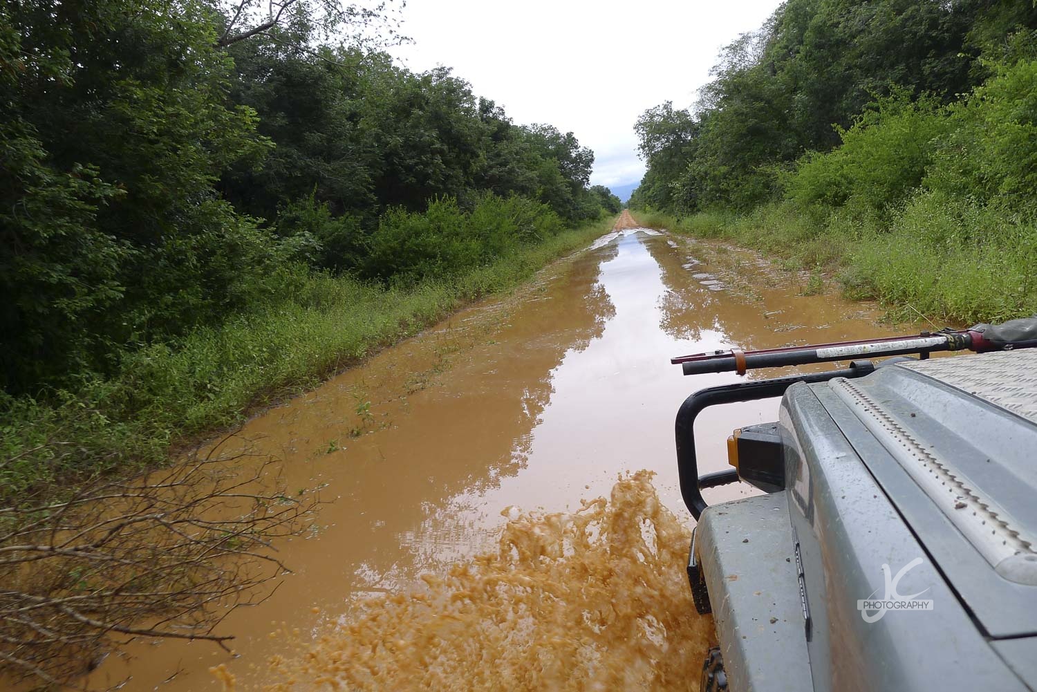 Kurz vor dem Fluss dann Entwarnung. Mir kamen drei Geländewägen entgegen, die den ganzen Vormittag am Mana gewartet haben, bis der Wasserspiegel sank. Der Weg dort hin war für mich eh schon ungewohnt. Nach fünf Jahren Parkbesuch in der absoluten Trockenzeit, hatte der Park nun ein ganz anderes Gesicht. Klar, es war überall richtig sattes grün. Die staubige Wellblechpiste, über die man in der trockenen Jahreszeit schneller fahren muss, musste nun ganz anders gefahren werden. Schlamm sollte man nicht ganz so schnell durchqueren 😉