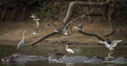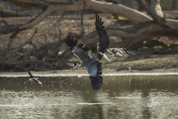 Back in the park, I spent quite some time at Chisasiko Pool this time and saw some nice sightings, like a fish eagle catching a fish and attacking a grey heron, a baboon with a midlife crisis and the beautiful african skimmers. The panned photos are spoonbills.