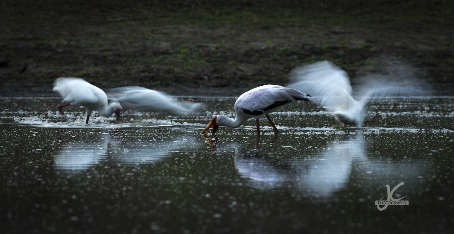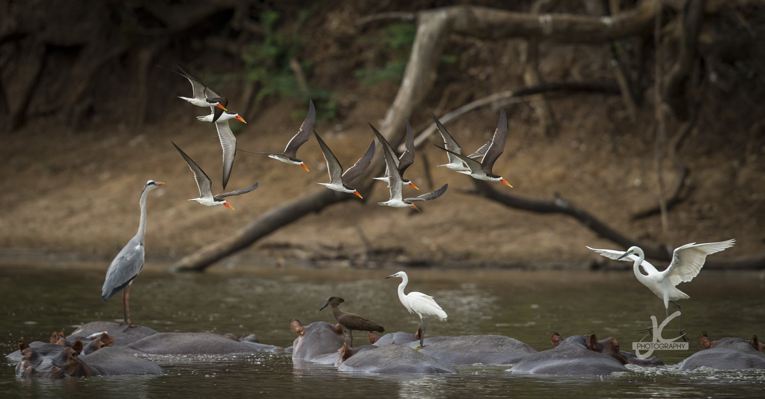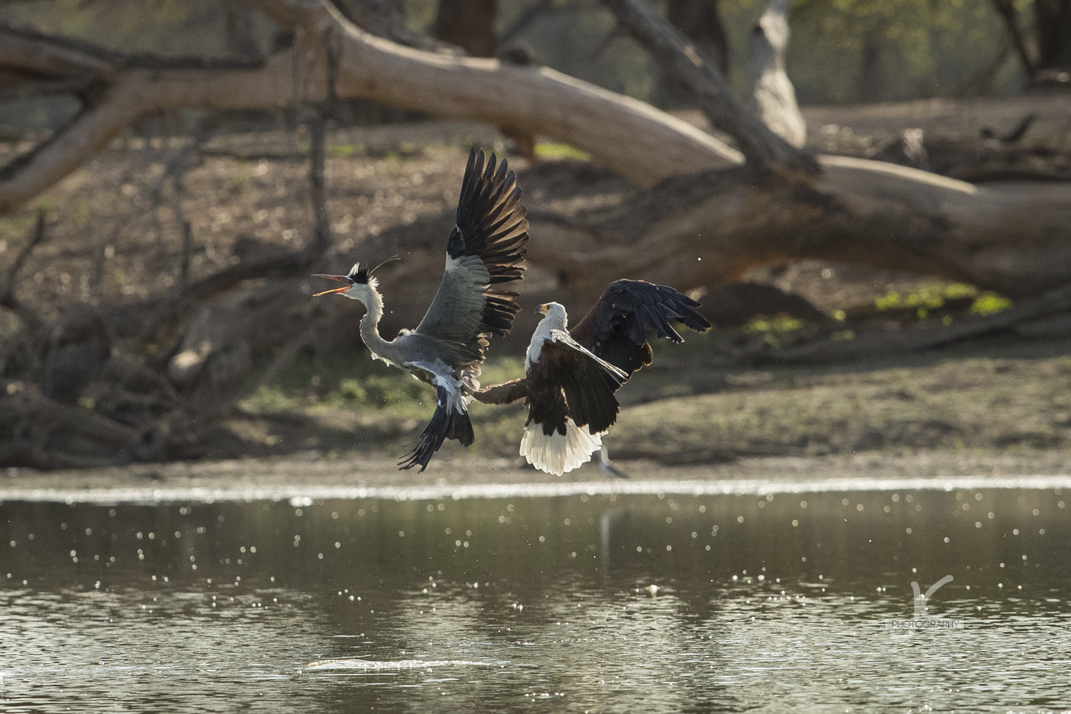 Back in the park, I spent quite some time at Chisasiko Pool this time and saw some nice sightings, like a fish eagle catching a fish and attacking a grey heron, a baboon with a midlife crisis and the beautiful african skimmers. The panned photos are spoonbills.