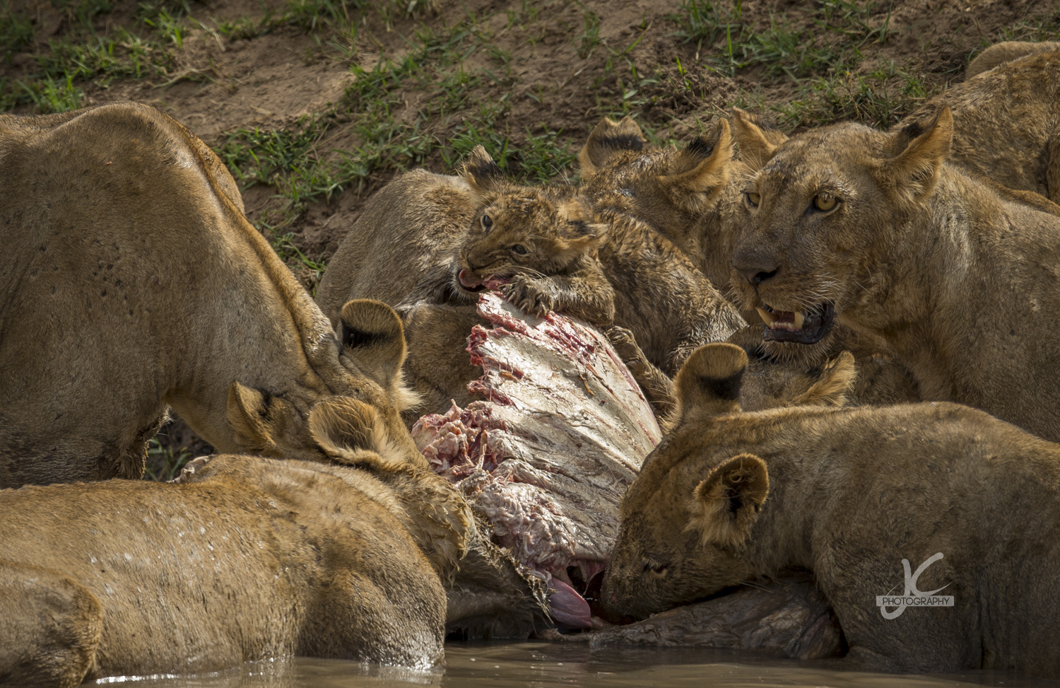 One day I found a shy pride of lions at Mana mouth. They killed a buffalo and were feasting on it. A meal full of mud since the carcass was laying in the water. It was not easy to take pictures of them, because they were very cautious.