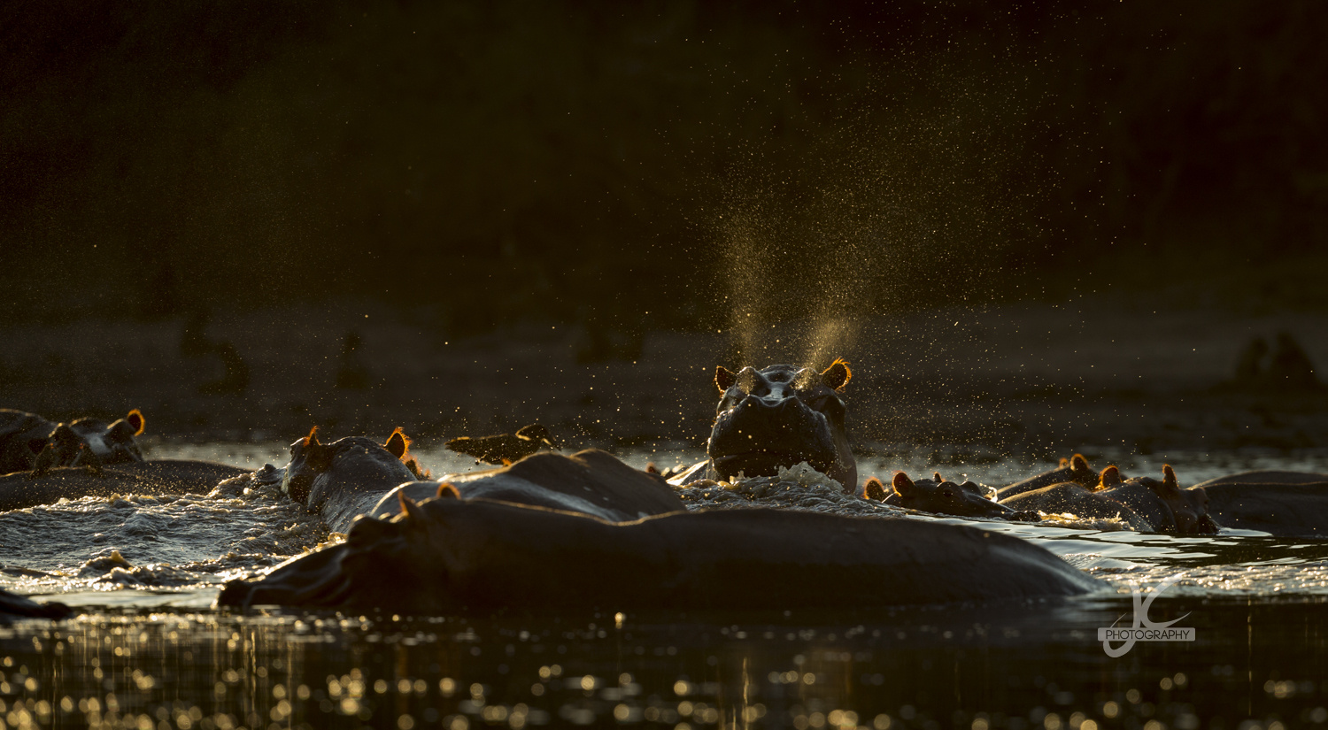 As you can see I have to position myself mostly in the sun, since the pools dried out quite a bit. And in these extremely hot temperatures, that is really a challenge! One day I decided to go to Long Pool and try to make photos of the hippos spraying water against the light. I figured I had to go there already in the afternoon, so they would get used to me. So I took all I needed (mat, water, cameras, binoculars) and I positioned myself on a sand bank. It took some sweat, concentration and patience, but I really enjoyed it. The spray sometimes has the form of a heart, don’t you think?